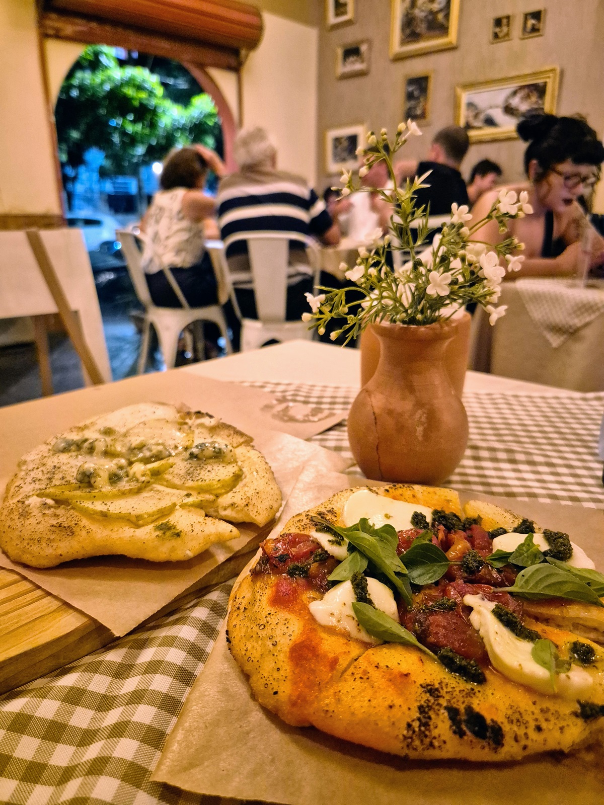 De origem napolitana, as pizzas Montanara servidas na pizzaria são individuais (15 cm), com massa de fermentação longa e com pouca adição de fermento. Desse modo, resulta em uma massa leve e de fácil digestão. Os recheios vão do clássico ao criativo e nós escolhemos a Margarete (molho de tomate artesanal, muçarela de búfala fresca, tomatinho confitado, pesto e manjericão – R$24,00) e a Carmem (creme de queijo, pera, gorgonzola, mel e pimenta preta – R$24,00).